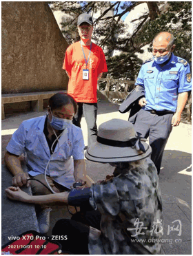 在休憩過(guò)程中,李女士低血糖犯了,倍感難受。天柱山工作人員張銳發(fā)現(xiàn)她狀況不對(duì),上前溫馨詢問(wèn)并熱情帶領(lǐng)她找到景區(qū)醫(yī)療人員,測(cè)量血壓,喝了一支葡萄糖。李女士的低血糖得到及時(shí)補(bǔ)充,休息一段時(shí)間后,精神緩和,體力恢復(fù)。在張銳的陪伴鼓勵(lì)下,李女士堅(jiān)持攀登到天柱山天池峰之巔,親自拍下了雄偉神奇的天柱山主峰影像。