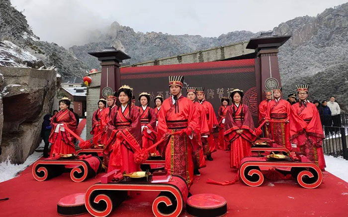 ????活動(dòng)當(dāng)日,在銀裝素裹的煉丹湖畔,一場(chǎng)典雅精致的“執(zhí)子之手 緣圓天柱”中式集體婚禮正式開(kāi)始,笙簫鼓樂(lè)齊奏祥瑞之聲,十對(duì)新人攜手走過(guò)幸福大道,“新人火上過(guò),日子過(guò)紅火”“新人邁馬鞍,步步保平安” ……在一聲聲喜慶吉祥的祝福聲里,新人們跨過(guò)火盆、馬鞍,步入典禮現(xiàn)場(chǎng)。潛山市委常委、天柱山管委會(huì)副主任舒寒冰為新人致主婚詞,見(jiàn)證和祝福十對(duì)新人締結(jié)良緣。