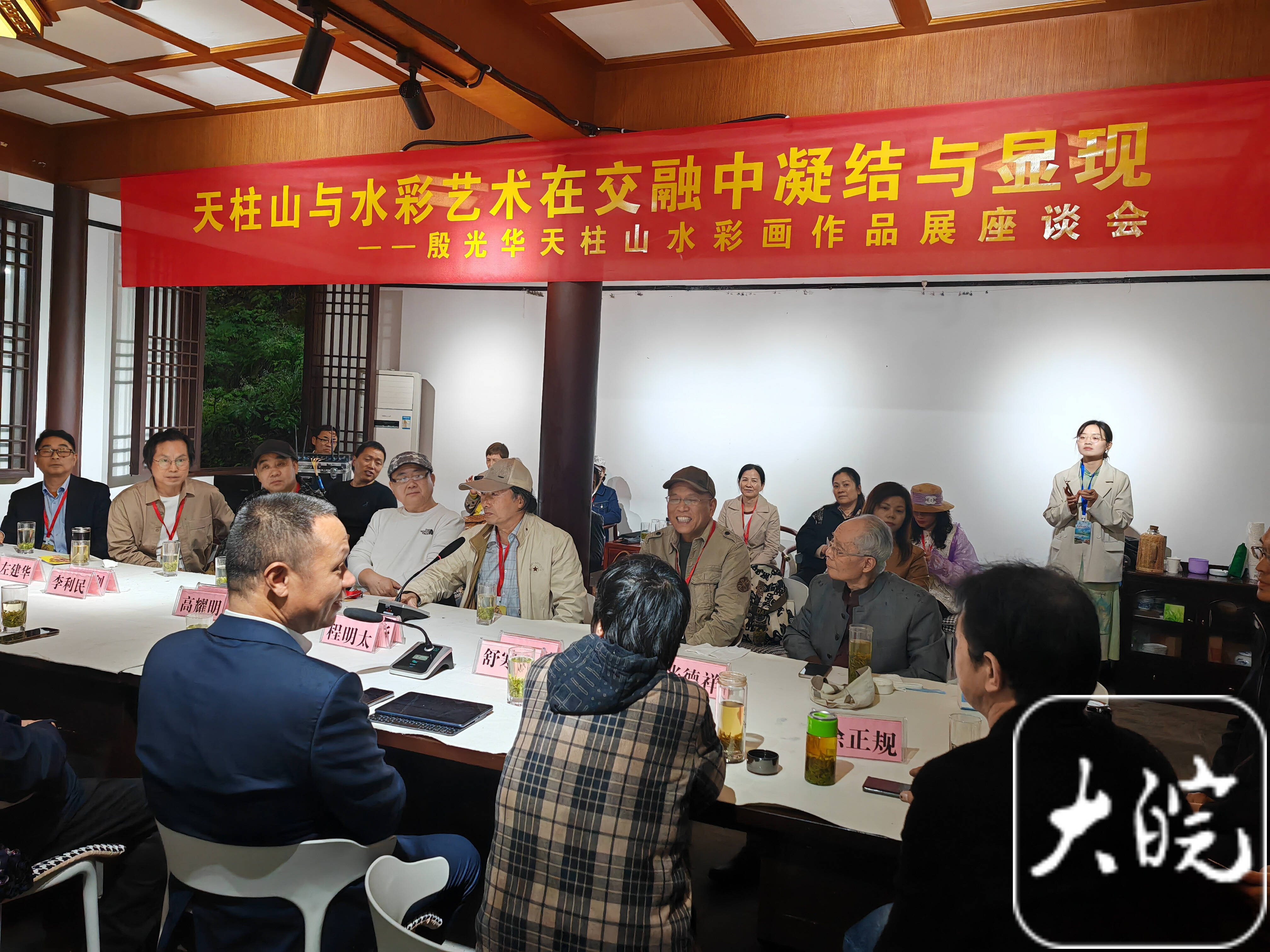 開(kāi)幕式上,天柱山管委會(huì)為殷光華頒發(fā)“天柱山駐山畫家”和“天柱山榮譽(yù)山民”證書,并舉行殷光華天柱山繪畫工作室揭牌儀式。殷光華向天柱山管委會(huì)和地質(zhì)公園博物館分別贈(zèng)送一件作品,并獲贈(zèng)收藏證書。4日下午,就“天柱山與水彩藝術(shù)在交融中凝結(jié)與顯現(xiàn)”舉行座談。