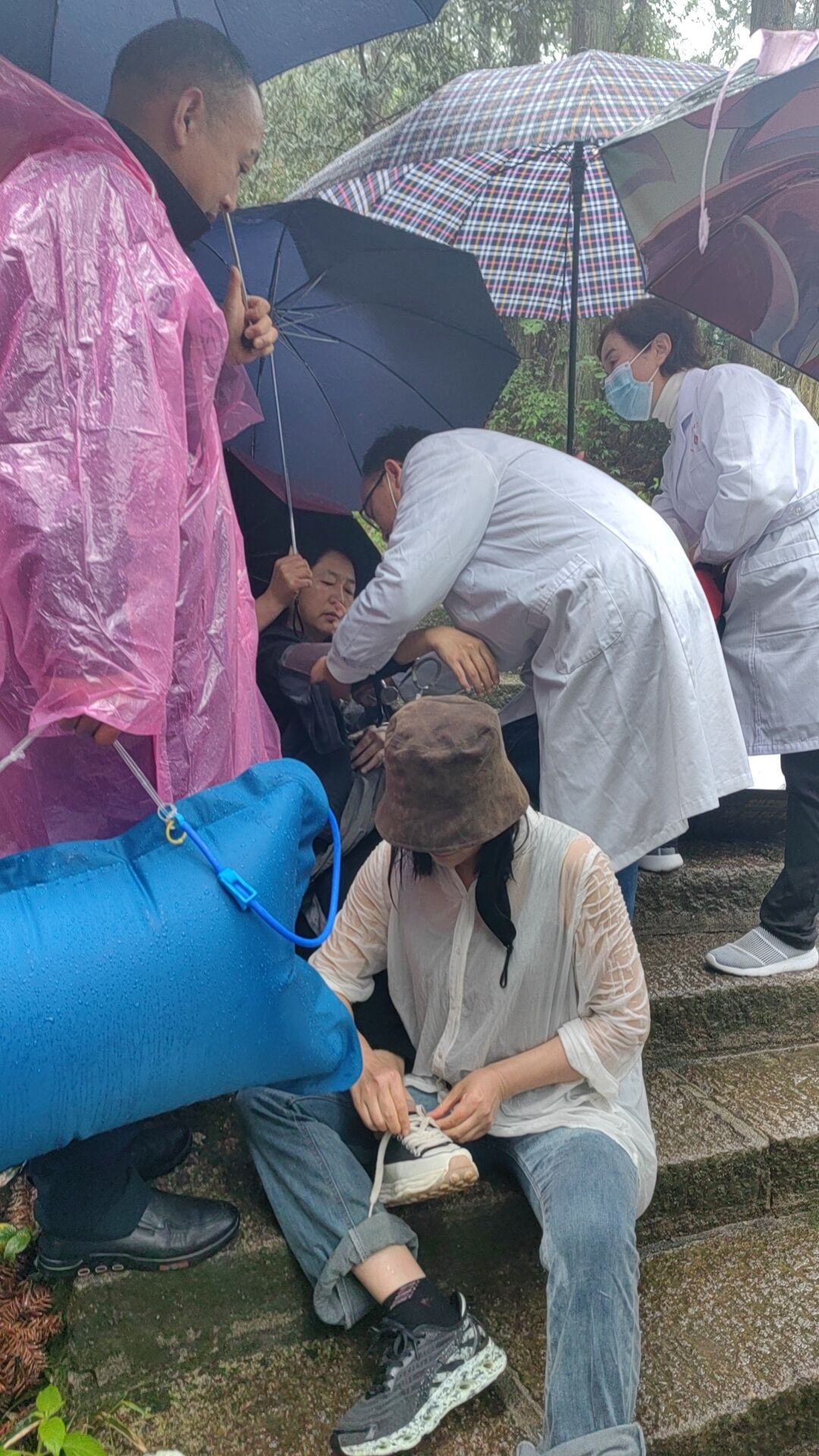 此時(shí)此刻,一場(chǎng)與時(shí)間賽跑的急速救援的暖心一幕,在天柱山景區(qū)真實(shí)上演。到達(dá)救援現(xiàn)場(chǎng),游客高女士呈現(xiàn)心慌、四肢無(wú)力、全身發(fā)抖、不能言語(yǔ)、時(shí)有惡心等狀態(tài),醫(yī)生給游客認(rèn)真仔細(xì)地做了檢查,表示情況十分危急,需及時(shí)到山下醫(yī)院就診。劉星第一時(shí)間撥通120急救電話,隊(duì)員汪小曲冒雨把高女士從迎真峰背負(fù)至牧羊河索道上站,路程約四五百米,然后坐索道下山并將游客抬上救護(hù)車(chē),送往潛山市中醫(yī)院就診,稍微歇停背負(fù)的汪小曲,已累得癱軟一旁,站立不穩(wěn)。