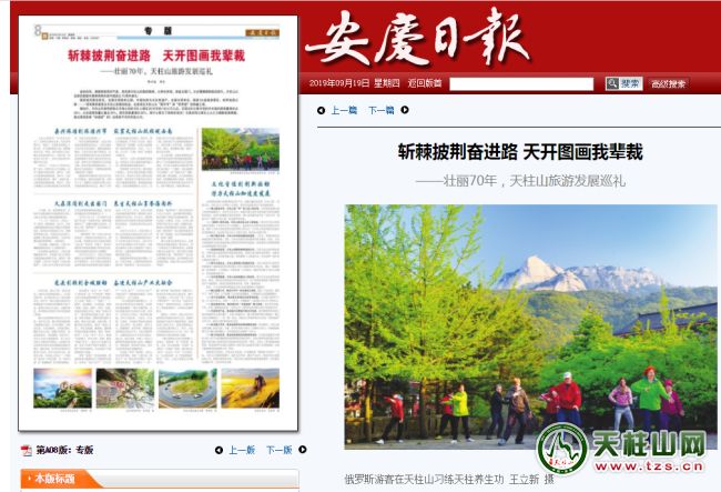 金秋的風,滿載著收獲的氣息,親撫著天柱山的滿目錦繡。從養(yǎng)在深閨,到走出國門,從步履蹣跚到超邁前行,天柱山以全新的面貌和累累碩果向新中國成立70周年獻禮!