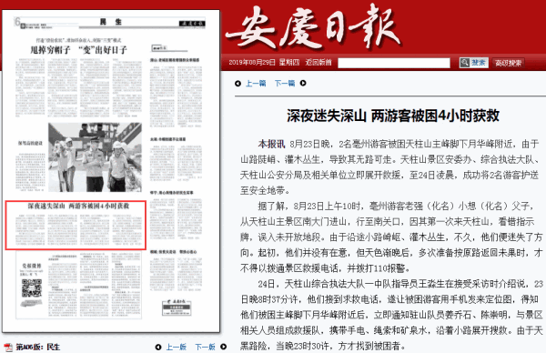 24日,天柱山綜合執(zhí)法大隊一中隊指導員王淼生在接受采訪時介紹說,23日晚8時37分許,他們接到求救電話,遂讓被困游客用手機發(fā)來定位圖,得知他們被困主峰腳下月華峰附近后,立即通知駐山隊員姜喬石、陳崇明,與景區(qū)相關(guān)人員組成救援隊,攜帶手電、繩索和礦泉水,沿著小路展開搜救。由于天黑路險,當晚23時30許,方才找到被困者。